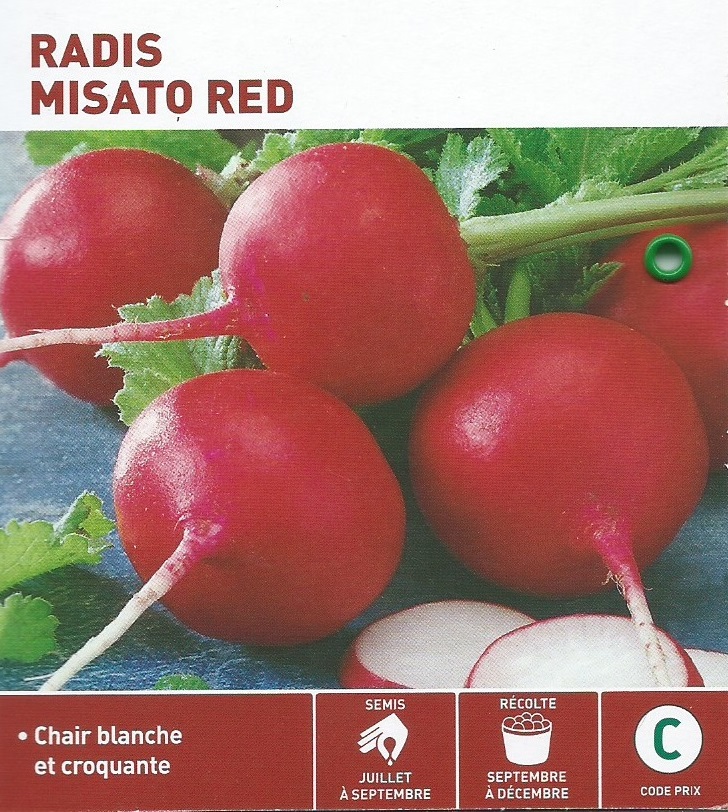 Au 16/08/2016 : Les haricots du 20/06, ne présentent pas beaucoup de gousses. Je fais table rase au profit d’un semis de saison d’une variété géante de Radis : Le radis MISATO RED. Prix code C et pas beaucoup de graine dans le sachet : il serait bien de faire ses propres graines depuis ce semis… C’est une variétéde radis qui pousse en dehors de la saison des autres variété de radis (pour les autres variétés Août c’est la fin de saison, pour le MISATO c’est la pleine saison !), et vu son prix ce doit être un radis de compétition !